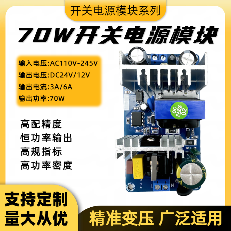 开关电源模块70W开关电源模块支持 AC 85-265V 宽电压输入,输出 12V/24V 可选。内置过载、短路、过压三重保护工业级电容搭配灌胶封装,适应 - 20℃~70℃宽温环境,小体积设计支持插针 / 导轨安装。广泛用于工控、安防、智能家居等场景,稳定耐用